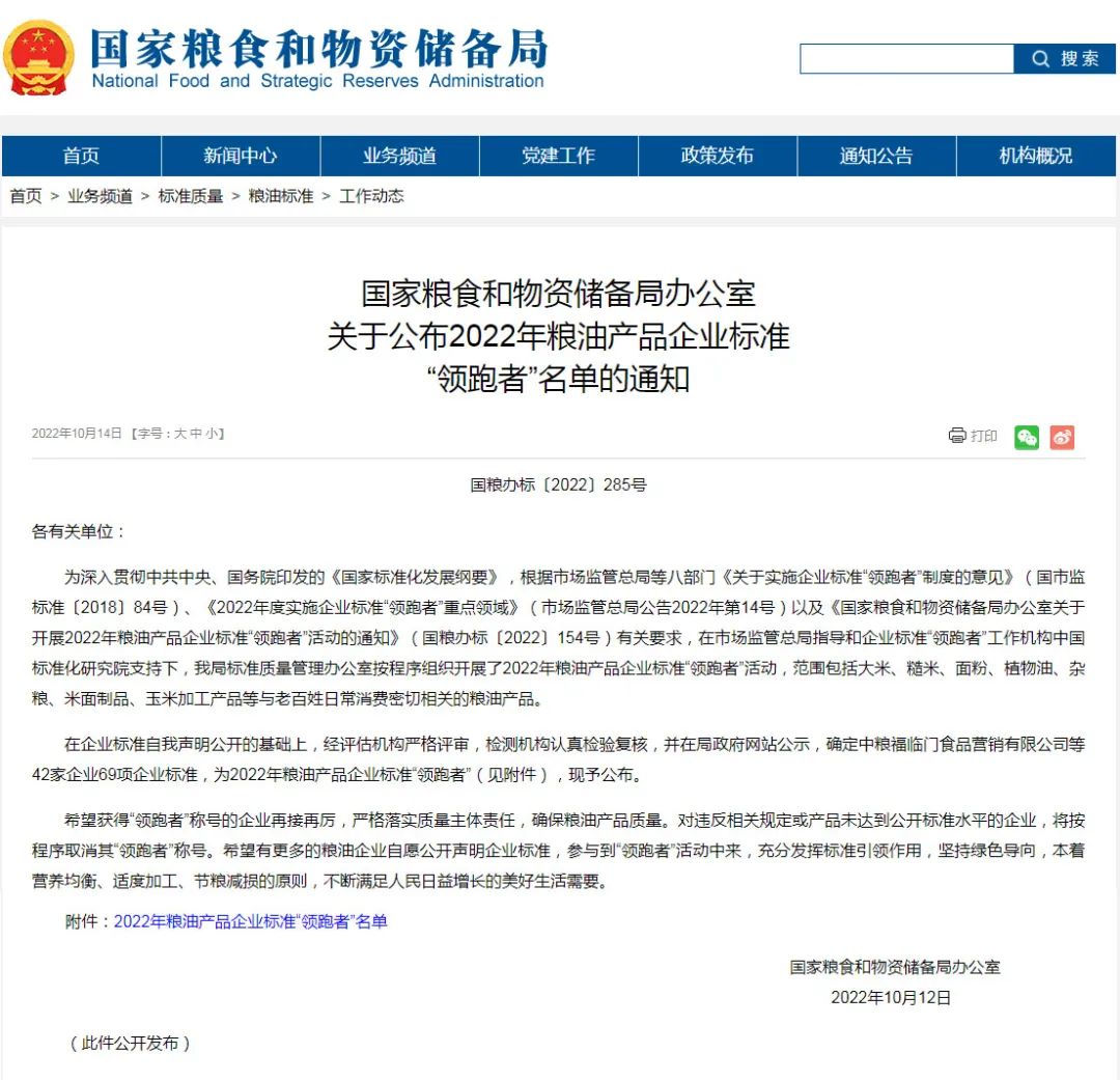 恭喜冠香居公司獲得2022年糧油產(chǎn)品企業(yè)標準領(lǐng)跑者!